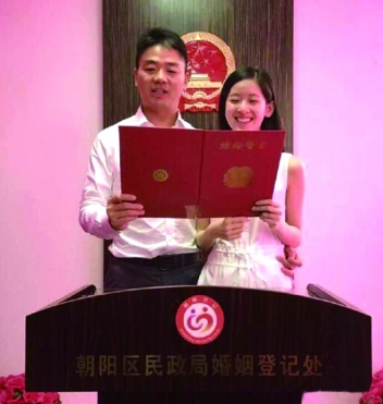 昨日,有微博曝出刘强东和“奶茶妹妹”章泽天现身北京朝阳区民政局领证结婚的照片,两人拿着结婚证合影,一脸幸福甜笑。之后,聚美CEO陈欧也发微博证实这一消息,笑称“老刘领证了,祝福!结婚了嫂子化妆品我送啊”。